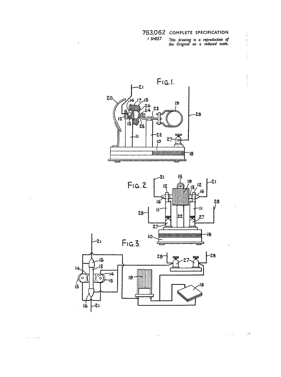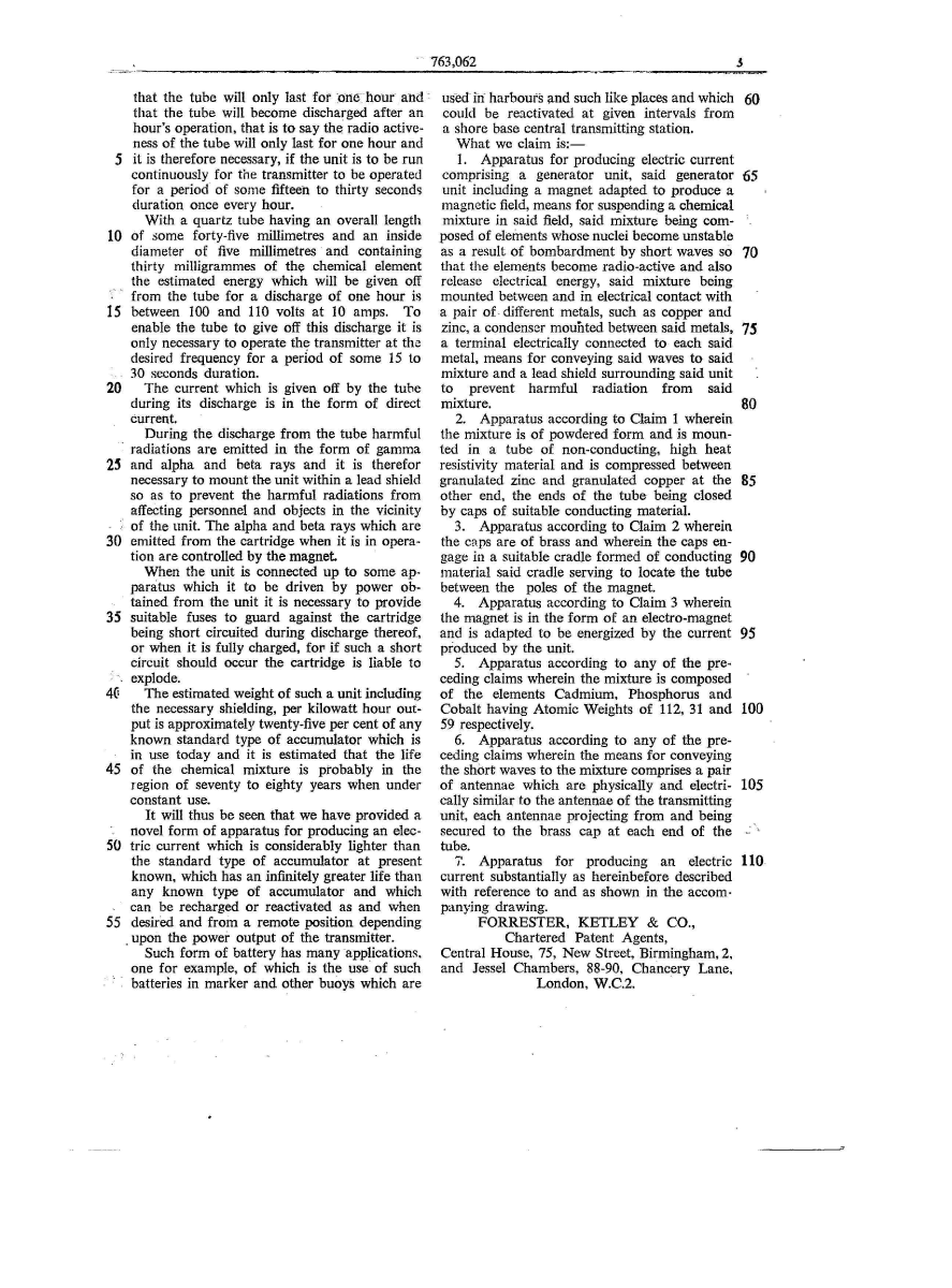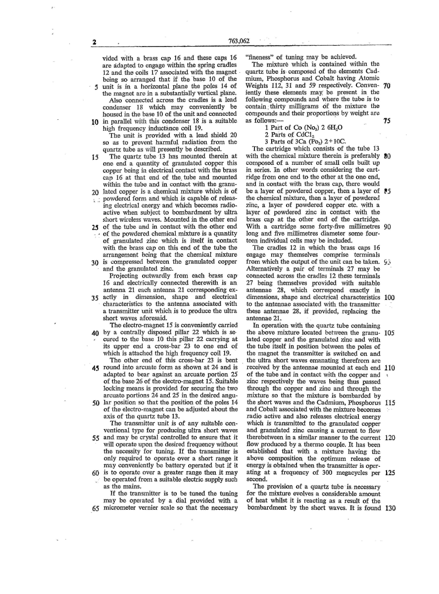 The invention is illustrated in the accompanying drawing wherein FIGURE 1 is a side elevation of one form of apparatus FIGURE 2 is an end elevation thereof and FIGURE 3 is a segmatic circuit diagram. In the form of our invention illustrated the generator unit comprises a base 10 upon which the various components are mounted this base 10 having projecting upwardly therefrom a pair of arms 11 which are adapted to form a cradle or housing 12 for a quartz tube 13 the cradle 12 being preferably made of spring material so that the tube 13 is firmly, yet removably held in position. The arms 11 are so disposed in relation to the poles 14 of an electro-magnet 15 that the tube 13 when in position is disposed immediately between the poles of the magnet so as to be in the strongest magnetic field created thereby. The magnet serves to control the alpha and beta rays emitted by the cartridge when it is in operation… See full text by clicking on preview below or download pdf version