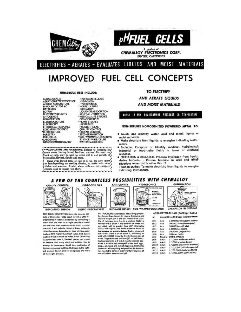 TECHNICAL DESCRIPTION: Any size or particle of Chemalloy yields about 5 volt at 200 microamperes in water as evidenced by connecting a meter with one lead to a single particle of metal and the other lead anywhere in the liquid or moist material. It will indicate higher or lower in liquids other than water depending on their pH. Sea water is about 50% higher than fresh water. Chili Sauce is about twice as much as water. Since Chemalloy is powderized over 1.000.000 pieces per pound to become that many electrical entities, this is enough to decompose liquid into multitudes of hydrogen gaseous bubbles. Hydrogen is the lightest element known and yet comprises one-ninth of the weight of water.