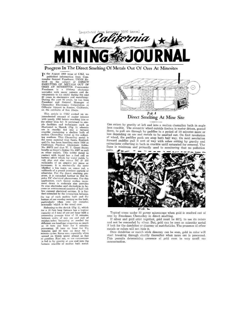 In the August 1969 issue of CMJ, we published information from Commander Samuel Freedman, USNR Retired on the subject of DIRECT SMELTING OF METALS OUT OF ORES AT MINESITES. Commander Freedman is a lifelong electronic specialist with many patents and developments to his credit during the past 40 years in electronics and metallurgy. During the past 20 years, he has been President and General Manager of Chemalloy Electronics Corporation at Gillespie Airport in Santee, California, on the outskirts of San Diego.