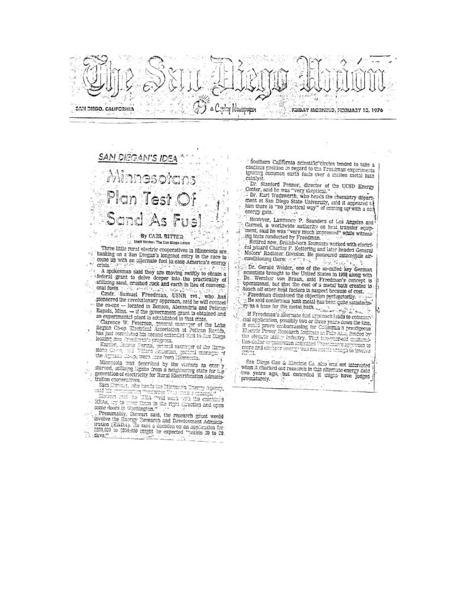 Three little rural electric cooperatives in Minnesota are banking on a San Diego’s longshot entry in the race to come up with an alternate fuel to ease America’s energy crisis. A spokesman said they are moving swiftly to obtain a federal grant to delve deeper into the practicality of utilizing sand, crushed rock and earth in lieu of conventional fuels.