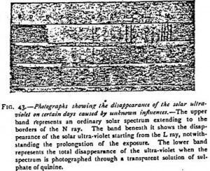 When working with solar light it is very soon noticed that numerous factors may vary enormously the production of the effluves resulting from the dissociation of matter, and consequently the intensity of the discharge. I shall come back to this subject when treating of the so-called negative leak. As soon as I had organized a series of regular observations, consisting of experiments with bodies having a constant action, I perceived that, when working for several days running at the same hour and in apparently identical weather, I suddenly observed considerable differences in the action of the electroscope. After having successively eliminated all intervening factors, I was left face to face with only one — the variation in the composition of the solar light. This was then only an hypothesis and had to be verified. As the variations were probably connected with the invisible parts of the spectrum, one single method of verification was at my disposal — the photography of this invisible region by the spectroscope. The only hint given in the textbooks was that the ultraviolet disappears as the sun approaches the horizon, which, however, the action of the electroscope ought to have sufficiently indicated. But as I was noticing variations in the effects at the same hours every day and at a time when the sun was very high, this hint explained nothing.