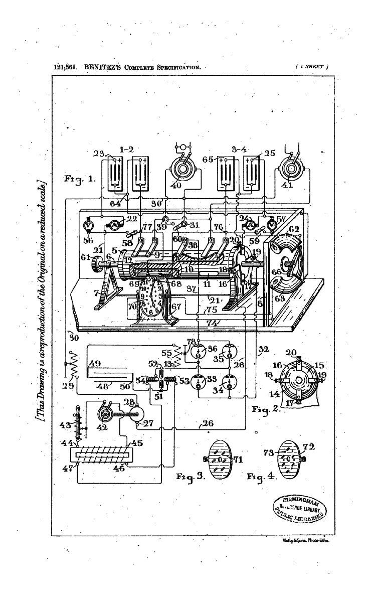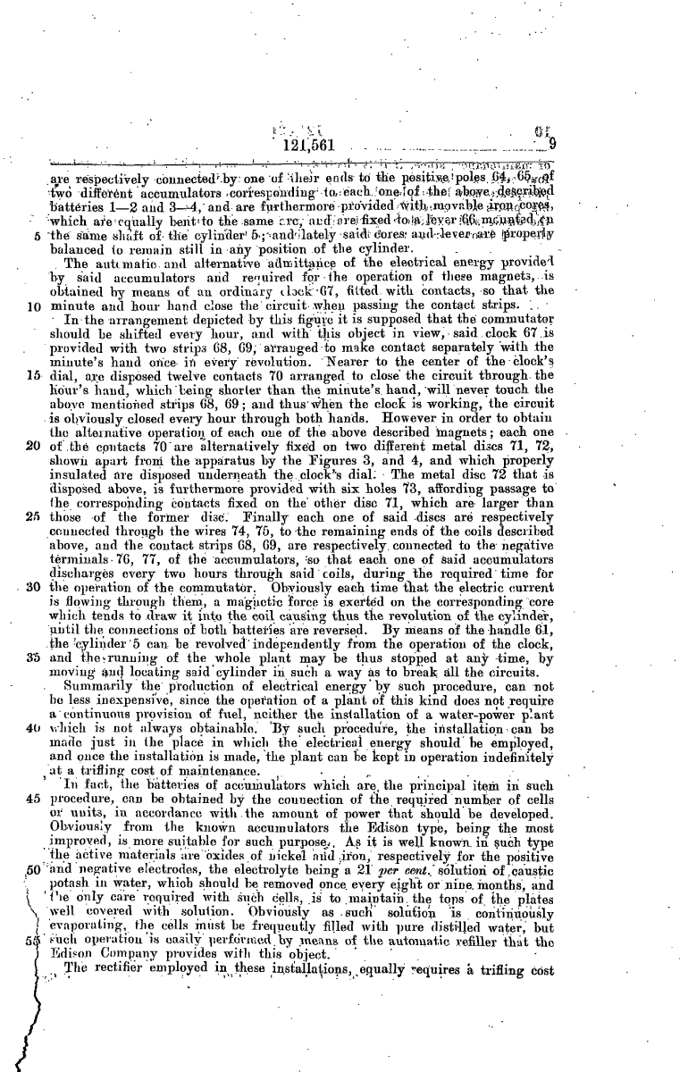 Benitez, C. April 10, 1918. Systems of charging and discharging galvanic batteries.-In an electric supply system comprising two sets of galvanic batteries, one set discharges to perform useful work and to charge the other set by means of an oscillatory circuit and a set of rectifiers. The battery connexions are varied by a commutator operated by solenoids, the circuits of which are controlled by a clock. In the position shown in Fig. 1 the commutator 5, mounted on a shaft 6, establishes the following discharging circuit for the battery 1-2-positive pole of battery, ammeter 22, lead 21, terminal 17, Figs. 1 and 2, segment 14, terminal 18, lead 26, motor 27, 28, lead 30, load 40, terminal 39, brushes and segment 9 of commutator 5, terminal 77 to negative pole of battery 1-2.; The motor 27, 28 drives an alternator 42 connected to the terminals 44, 45 of the primary winding of a transformer. The terminals 46, 47 of the secondarv winding of the transformer are connected to a condenser 48 forming with an inductance 55 and an arc 51, 52 an oscillatory circuit, which operates as a source of energy to charge the battery 3-4 through rectifying valves 33, 34, 35, and 36 and the following circuit, lead 32, terminal 19, Figs. 1 and 2, segment 15, terminal 20, ammeter 24, battery 3-4, brushes and connexion 10 of commutator, and lead 37. After a pre-determined time, the commutator 5 is operated to place the battery 3-4 on discharge through the load 41 and motor 27, 28, and to place the battery 1-2 on charge from the oscillating circuit.; The commutator 5 is operated by a handle or electro-magnetically by one of two solenoids 62, 63, the circuits of which are controlled by a clock 67. The minute hand of the clock is adapted to engage contacts 68, 69, and the hour hand is adapted to engage twelve studs 70. Six of the studs 70 are placed upon a metal disk 72, Fig. 4, provided with six holes through which the six other studs 70 on the disk 71, Fig. 3, pass. The disks 71 and 72 are connected respectively to solenoids 62, 63, Fig. 1, by leads 74, 75. In the position shown, the solenoid 62 is energized from one-half the battery 3-4; while one hour later the solenoid 63 is energized from one-half the battery 1-2 to change the position of the commutator. Specification 14311/15, which describes a battery charging and discharging system, is referred to.