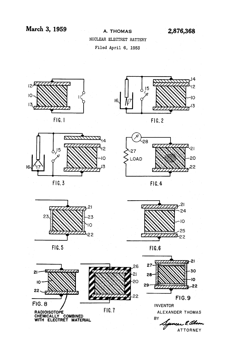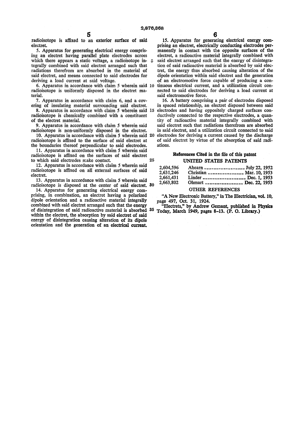 Heretofore, two general approaches have been made toward the direct utilization of the energy provided by certain nuclear reactions for the production of electric current, i. e., a source of battery power. One approach has been extensively investigated by Emest G. Under as exemplified by United States Patents 2,517,120; 2,527,945; 2,548,225; 2,555,143 and 2,598,925, which may be designated as the “direct” type of nuclear battery wherein current is produced by utilizing the directionality of a or 0 rays between the collecting electrodes. In essence, the battery comprises a radioactive source and one or more collector electrodes for collecting charged particle rays from the source, and means for applying the resultant unidirectional potential between the source and collector electrodes to a load. The efficiency of this type of battery is low at low voltages, and with presently known radioistopes can have reasonable efficiency only in the region between about 5 and 500 kilovolts. This being an unreasonable voltage for most applications where the relatively small currents generated can be used, batteries of this type have limited usefulness.
