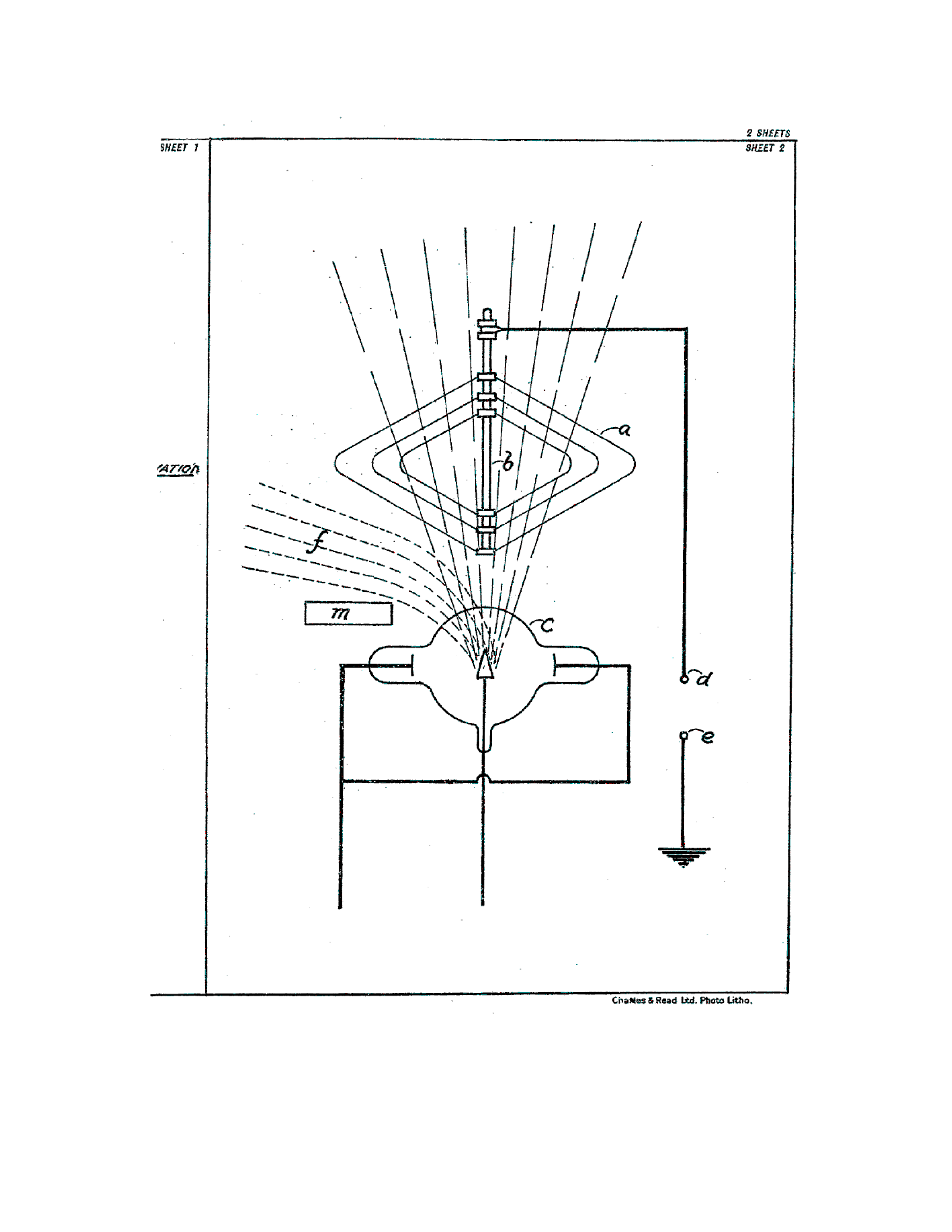 231,247. Orlando, S. Jan. 3, 1924. Aerials and like radiating and receiving conductors.-Energy in the form of electromagnetic waves, or electrostatic charges in the ether, is absorbed bv or radiated from a network of metallic conductors utilized in combination with an impinging stream of Rentgen rays. The aerial network consists of a rhomboid of fine wires a supported by a central conductor b, which is earthed at m. A motor or other receiving apparatus is connected between the points d, e. Rentgen rays from a discharge tube c are stated to form an ionized beam of air which increases the absorption of energy by the network a. A magnet m deflects any electron emission f away from the path of the rays.
