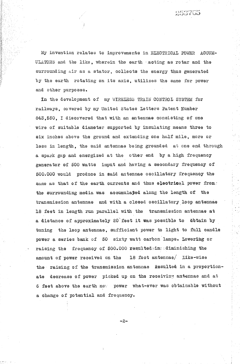 In the development of my WIRELESS TRAIN CONTROL SYSTEM for railways, covered by my United States Letters Patent Number 843,550, I discovered that with an antenna consisting of one wire of suitable diameter supported by insulating means 3 to 6 inches above the ground and extending one half mile, more or less in length, the said antenna being grounded at one end through a spark gap and energized at the other end by a high frequency generator of 500 watts input and having a secondary frequency of 500,000 would produce in said antenna oscillatory frequency the same as that of the earth currents, and thus electrical power from the surrounding media was accumulated along the length of the transmission antenna and with a closed oscillatory loop antenna 18 feet ion length run parallel with the transmission antenna at a distance of approximately 20 feet it was possible to obtain by tuning the loop antenna, sufficient power to light to full candle power a series bank of 50 60-watt carbon lamps [3 kw]. Lowering or raising the frequency of 500,000 resulted in diminishing the amount of power received in the 18-foot antenna. Likewise, the raising of the transmission antenna resulted in a proportionate decrease of power picked up on the receiving antenna and at 6 feet above the earth no power whatever was obtainable without a change of potential and frequency.