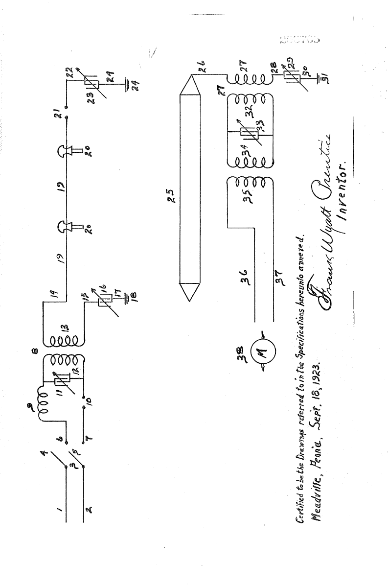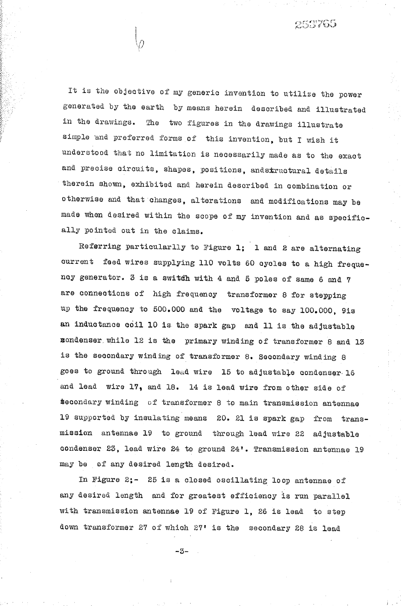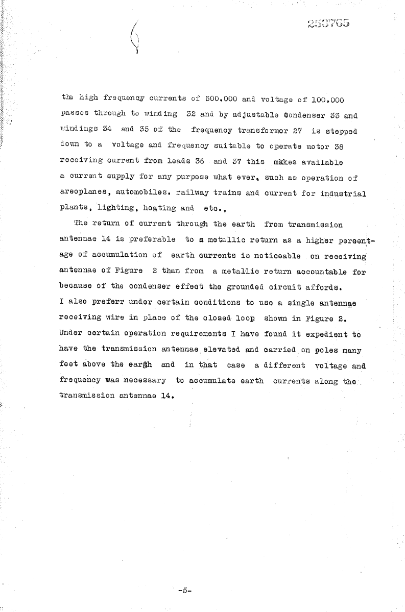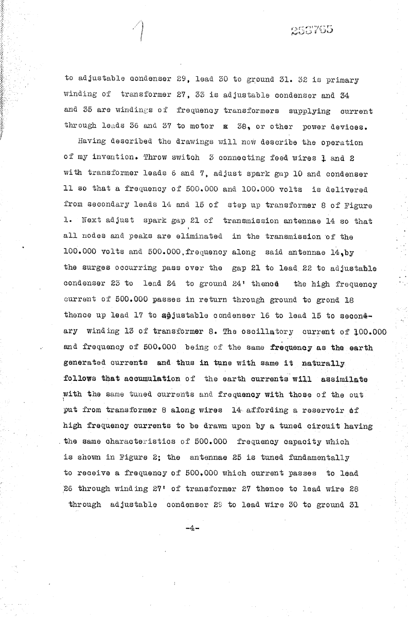 Having described the drawings, I will now describe the operation of my invention. Throw switch 3 connecting feed wires 1 and 2 with transformer leads 6 and 7, adjust spark gap 10 and condensor 11 so that a frequency of 500,000 and 100,000 volts is delivered from secondary leads 14 and 15 of step up transformer 8 of Figure 1. Next adjust spark gap 21 of transmission antenna 14 so that all nodes and peaks are eliminated in the transmission of the 100,000 volts and 500,000 frequency along said antenna 14, by the surges occurring pass over the gap 21 to lead 22 to adjustable condensor 16 to lead 15 to secondary winding 13 of transformer 8. The oscillatory current of 100,000 and frequency of 500,000 being of the same frequency as the earth generated currents and thus in tune with same, it naturally follows that accumulation of the earth currents will assimilate with the same tuned currents and frequency with those of the output from transformer 8 along wires 14, affording a reservoir of high frequency currents to be drawn upon by a tuned circuit having the same characteristics of 500,000 frequency capacity which is shown in Figure 2; the antenna 25 is tuned fundamentally to receive a frequency of 500,000 which current passes to lead 26 through winding 27’ of transformer 27, thence to lead wire 28 through adjustable condensor 29 to lead wire 30 to ground 31. The high frequency currents of 500,000 and voltage of 100,000 passes through to winding 32 and by adjustable condensor 33 and windings 34 and 35 of the frequency transformer 27 is stepped down to a voltage and frequency suitable to operate motor 38 receiving current from leads 36 and 37. This makes available a current supply for any purpose whatever, such as operation of railway trains and current for industrial plants, lighting, heating, etc.