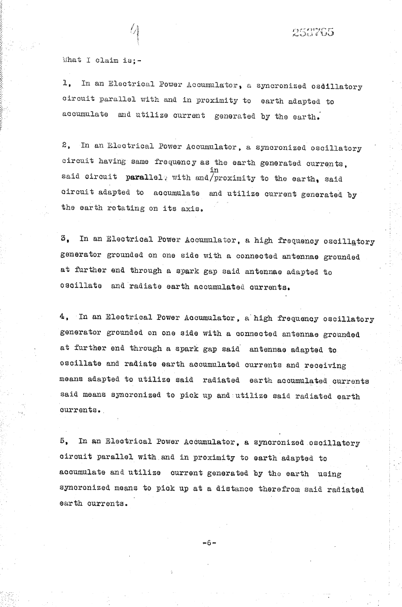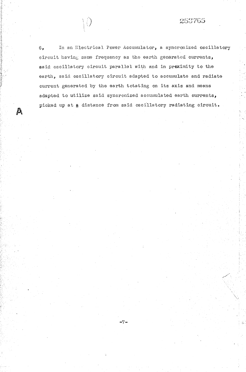 - In an Electrical Power Accumulator, a synchronized oscillatory circuit having same frequency as the earth generated currents, said oscillatory circuit parallel with and in proximity to the earth, said oscillatory circuit adapted to accumulate and radiate current generated by the earth rotating on its axis and means adapted to utilize said synchronized accumulated earth currents, picked up at a distance from said oscillatory radiating circuit.