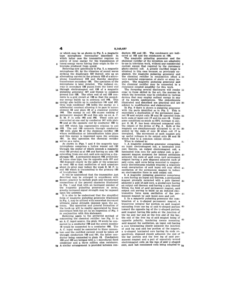 It is also to be understood that the simplified form of magnetic pulsating generator illustrated in Fig. 1, may be utilized with somewhat decreased ultimate signal strength imposed upon the antenna. The operation and general formation of the hook-up will be readily appreciated by those conversant with the art by an inspection of Fig. 5 in conjunction with this statement.