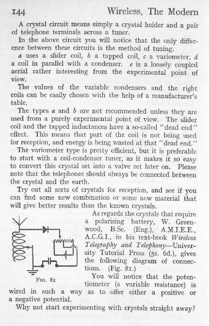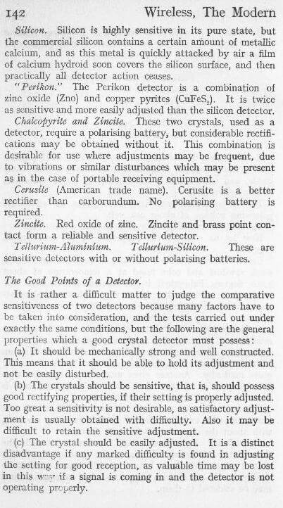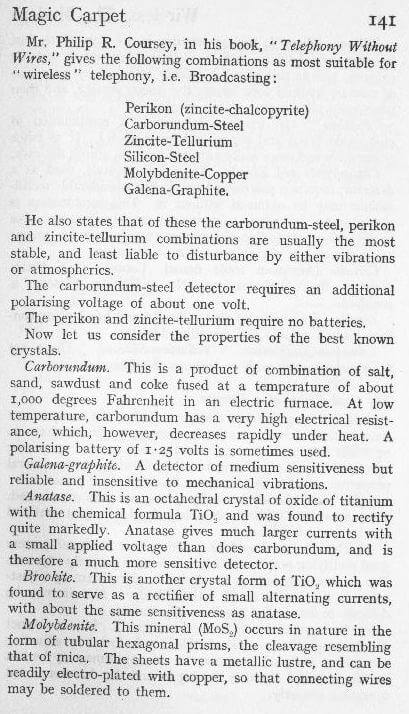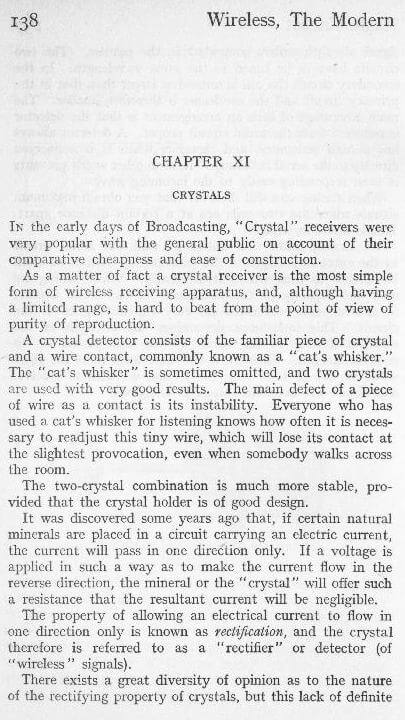There exists a great diversity of opinion as to the nature of the rectifying property of crystals, but this lack of definite knowledge does not preclude us form using crystals for the purpose of “wireless” reception.