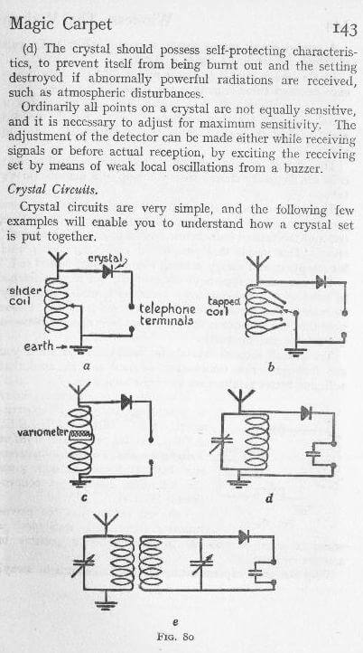 Crystal circuits are very simple and the following few examples will enable you to understand how a crystal set is put together. (Fig. 80)
