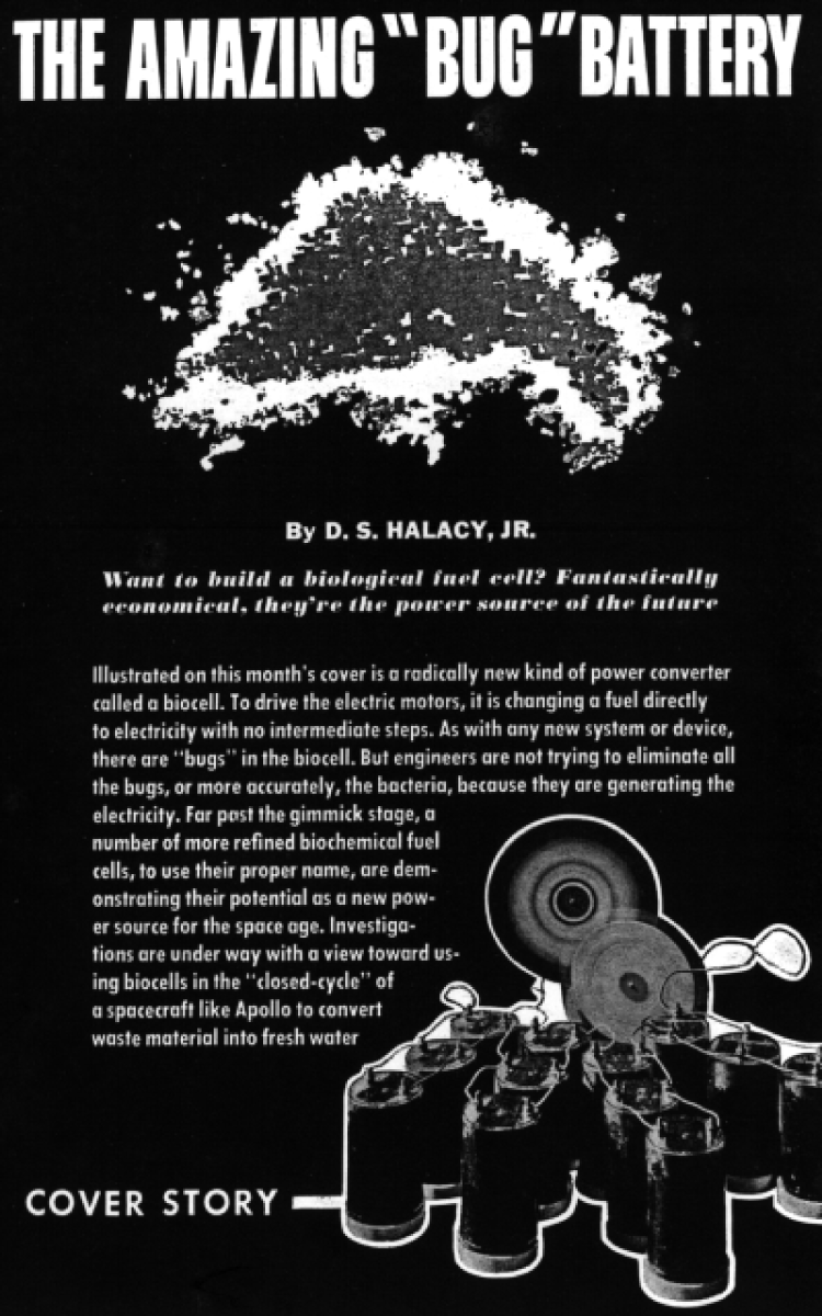 Illustrated on this month’s cover is a radically new kind of power converter called a biocell. To drive the electric motors, it is changing a fuel directly to electricity with no intermediate steps. As with any new system or device, there are “bugs” in the biocell. But engineers are not trying to eliminate all the bugs, or more accurately, the bacteria, because they are generating the electricity. Far past the gimmick stage, a number of more refined biochemical fuel cells, to use their potential as a new power source for the space age. Investigations are under way with a view toward using biocells in the “closed-cycle” of a spacecraft like Apollo to convert waste material into fresh water and food and, at the same time, generate electricity to power radios, radar and telemetry gear, and other on-board auxiliary equipment.