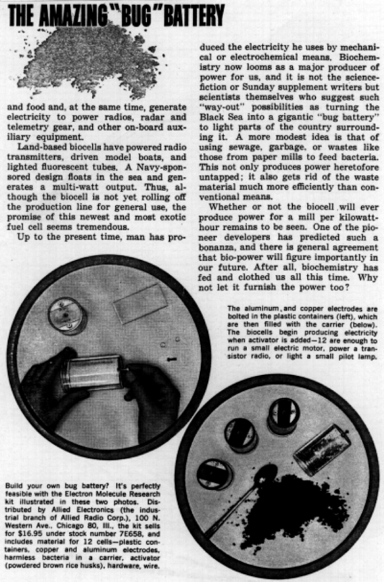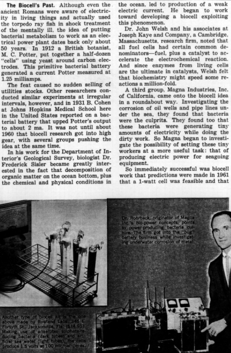So immediately successful was biocell work that predictions were made in 1961 that a 1-watt cell was feasible and that a radio might be powered with bacterial electricity within a few years. These things materialized even sooner than hoped for. In 1962, Sisler and his associates in a newly formed private firm demonstrated a small transmitter with a range of 15 miles, and also a model boat operating on biocells, tapping the water it floated in.