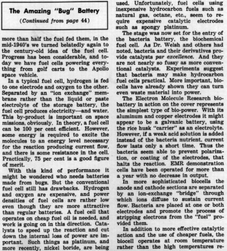 The feat caused no sudden selling of utilities stocks. Other researchers conducted similar experiments at irregular intervals, however, and in 1931 B. Cohen at Johns Hopkins Medical School here in the United States reported on a bacterial battery that upped Potter’s output to about 2 ma. It was not until about 1960 that biocell research got into high gear, with several groups pushing the idea at the same time.