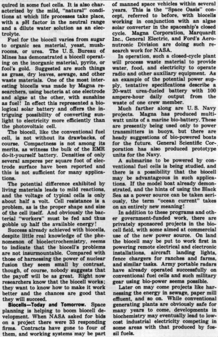 Many scientists feel that attempts to exploit bio-power this early are putting the cart before te horse and that many more years of basic study are indicated first. However, Ernest Cohn, head of NASA’s Electrochemical Technology Projects, points out an interesting parallel in the chemical industry. While papers and theses are still being written describing original research on production of ammonia, we nevertheless have an excess of manufacturing capacity for the compound.
