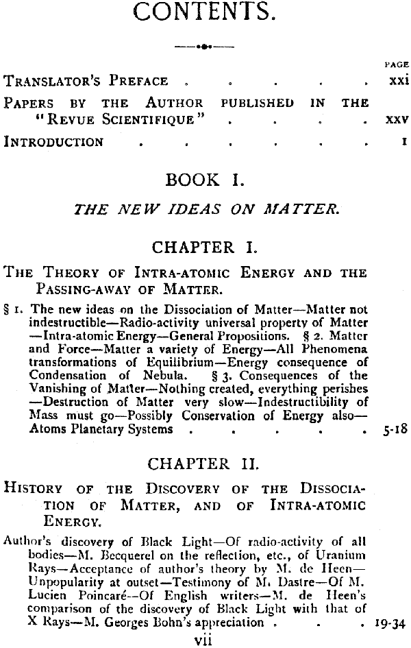 (1) The New Ideas on the Dissociation of Matter — Matter not indestructible — Radioactivity universal property of matter — Intra-atomic energy — General Propositions – (2) Matter and Force — Matter as a variety of energy — All phenomena transformation of equilibrium — Energy consequence of condensation of nebula – (3) Consequences of the vanishing of matter — Nothing created, everything perishes — Destruction of matter very slow — Indestructibility of mass must go — Possibly conservation of energy also — Atoms planetary systems.