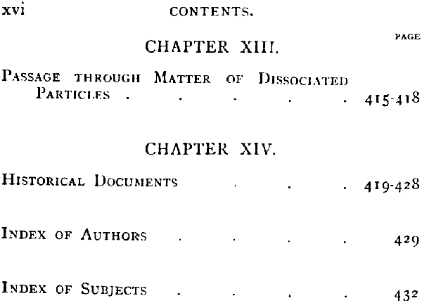 (1) The First Interpretations — Crookes’ ultra-gaseous state — Kinetic theory of gases described — Cathode rays really identical with particles of dissociating matter – (2) Interpretations now current — Discovery of x and uranium rays make old explanations untenable — Ionization merely dissociation — Contrasts between ordinary and ionic electricity — Dissociation products identical for all substances.