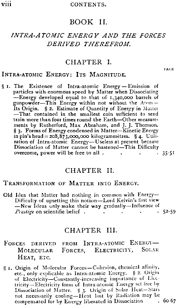 (1) Origin of Molecular Forces — Cohesion, chemical affinity, etc., only explicable as intra-atomic energy – (2) Origin of Electricity — Constantly increasing importance of electricity — Electricity form of infra-atomic energy set free by dissociation of matter – (3) Origin of Solar Heat — Stars not necessarily cooling — Heat lost by radiation may be compensated for by energy liberated in dissociation