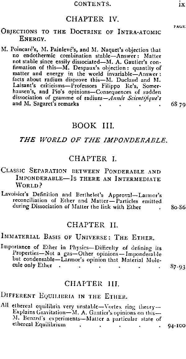 M. Poincare’s M. Painleve’s, and M. Naquet’s objection that no endothermic combination stable — Answer: matter not stable since easily dissociated — M. Gauthier’s confirmation of this — M. Despaux’s objection: quantity of matter and energy in the world invariable — Answer: facts about radium disprove this — M. Duclaud and M. Laisant’s criticisms — Prof. Re’s, Somerhausen’s, and Pio’s opinions — Consequences of sudden dissociation of gram of radium — Ann. Scientifique’s and M. Sagaret’s remarks.