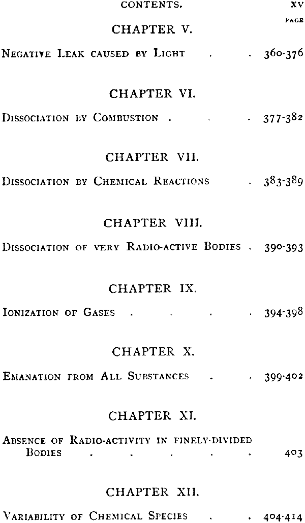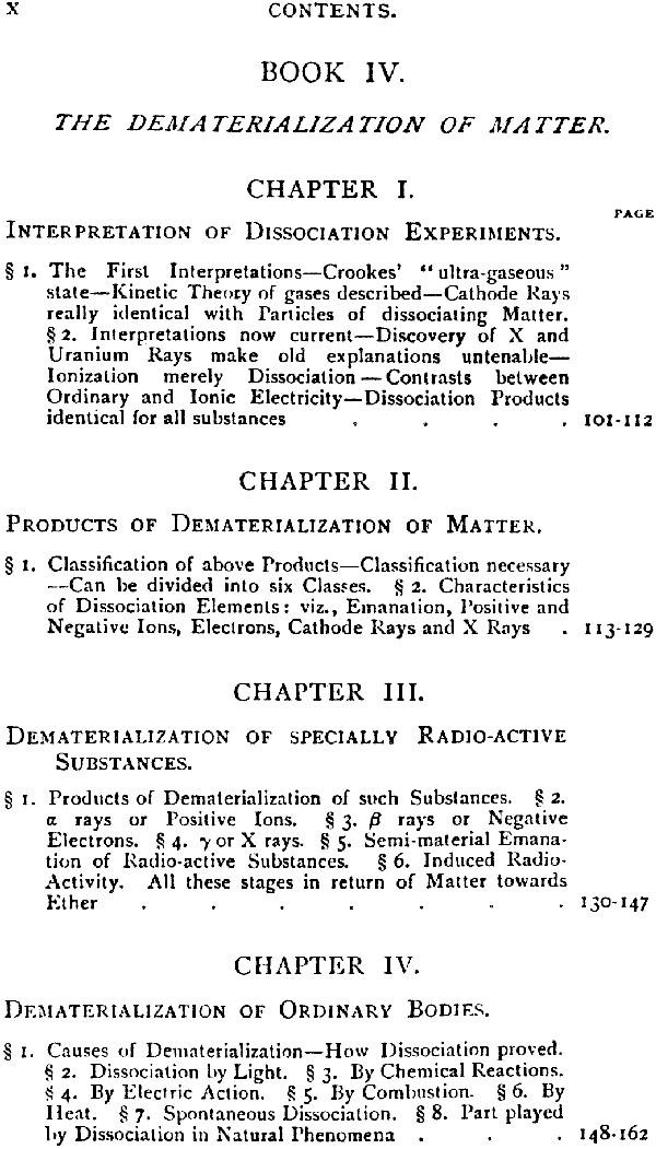 (1) Causes of dematerialization – How dissociation proved – (2) Dissociation by light – (3) By Chemical reactions – (4) By electric action – (5) By combustion – (6) By heat – (7) Spontaneous dissociation – (8) Part played by dissociation in natural phenomena.