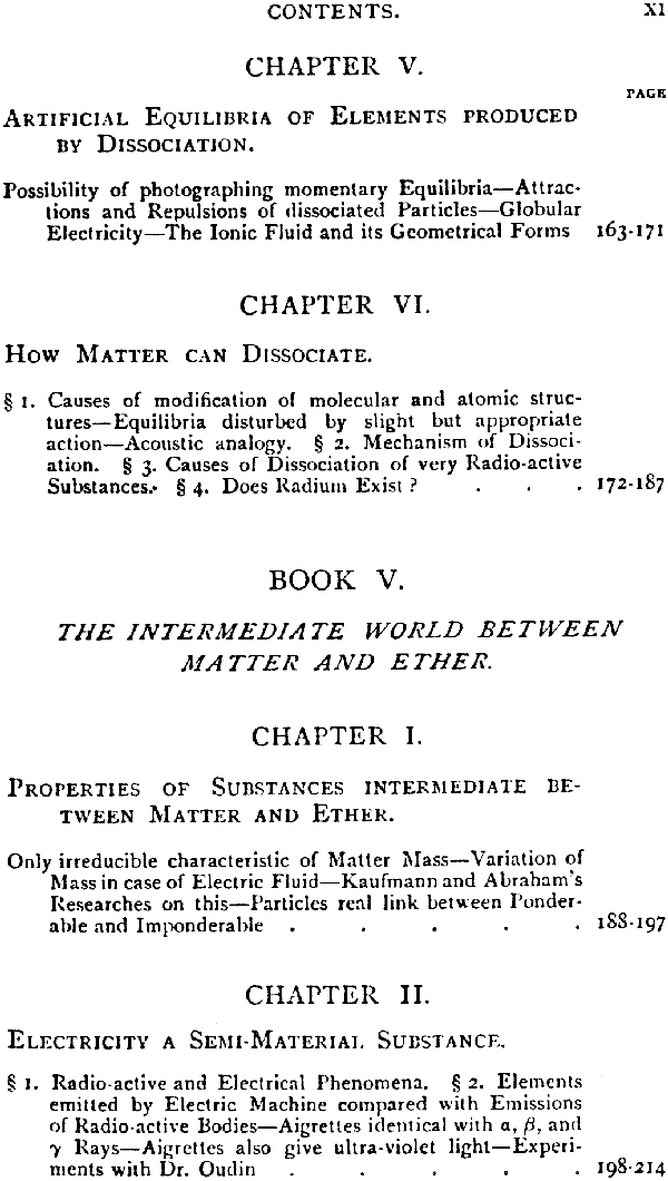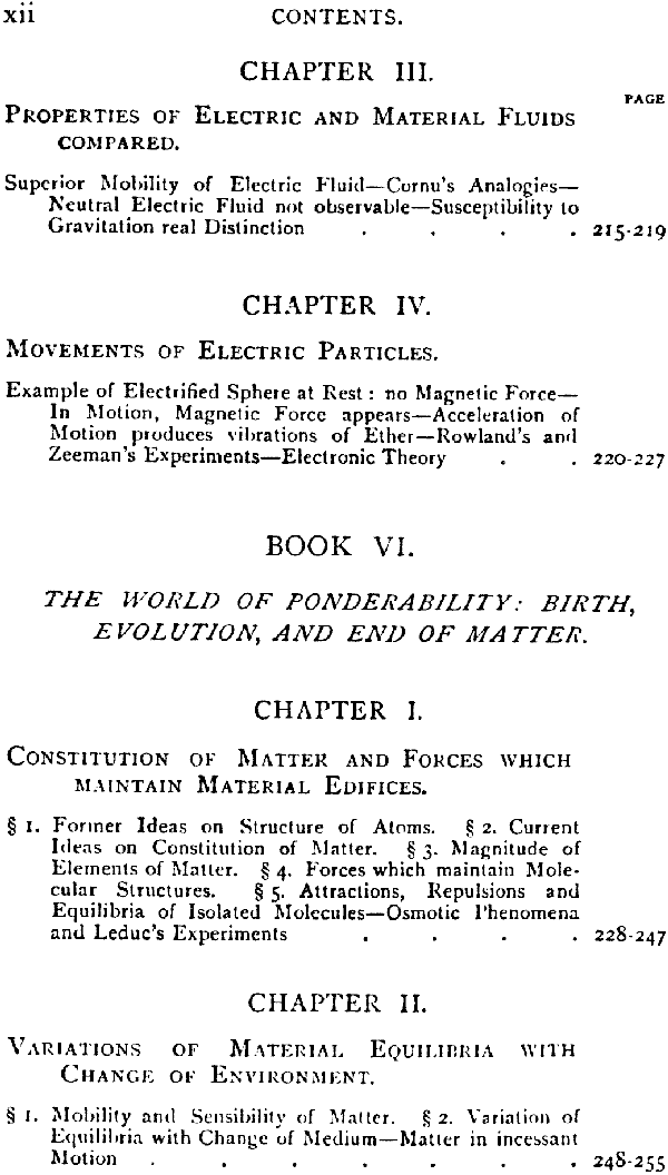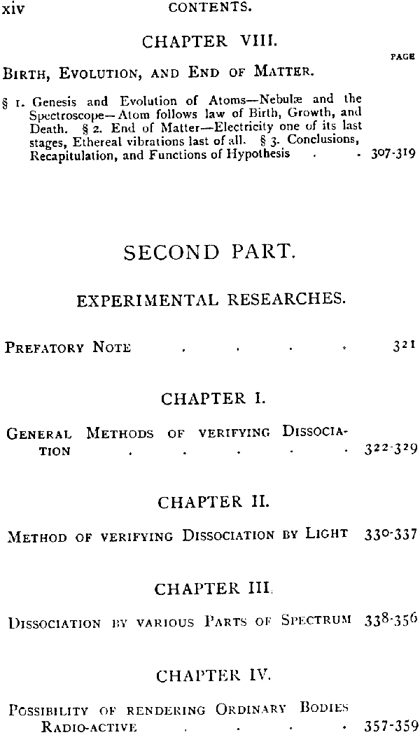 (1) Genesis and evolution of atoms — Nebulae and the spectroscope — Atom follows law of birth, growth, and death – (2) End of matter — Electricity one its last stages, ethereal vibrations last of all – (3) Conclusions, recapitulation, and functions of hypothesis.